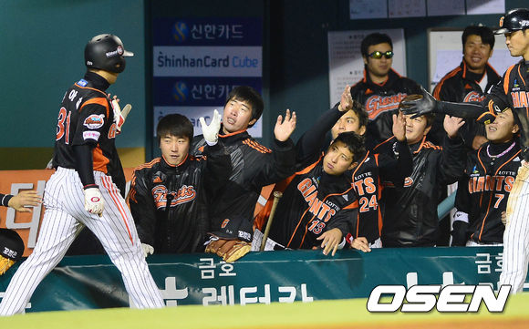26일 오후 서울 잠실구장에서 열린 '2013 한국야쿠르트 세븐 프로야구' LG 트윈스와 롯데 자이언츠의 경기 5회초 2사 2루 김대우의 1타점 적시타에 홈을 밟은 손아섭이 덕아웃에서 동료들과 하이파이브 하고 있다.