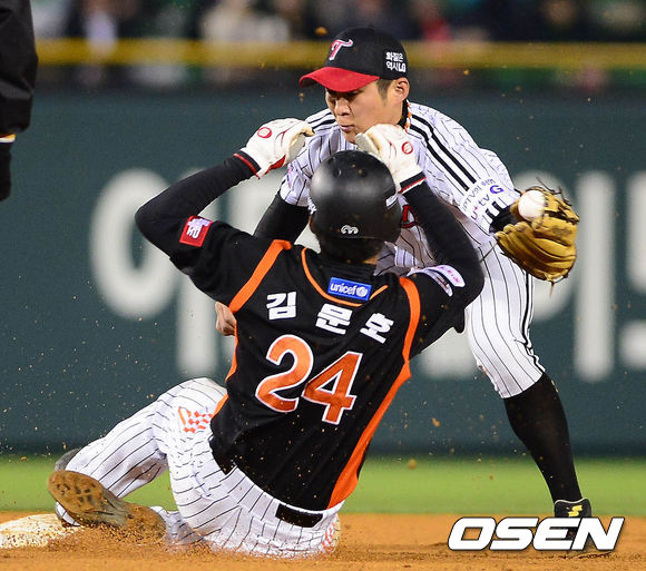 26일 오후 서울 잠실구장에서 열린 '2013 한국야쿠르트 세븐 프로야구' LG 트윈스와 롯데 자이언츠의 경기 5회초 2사 1루 손아섭 타석, 1루주자 김문호가 도루에 성공하고 있다.