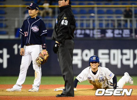 26일 오후 창원 마산야구장에서 열린 2013 한국야쿠르트 세븐프로야구 NC 다이노스와 두산 베어스의 경기, 5회말 2사 1루에서 NC 차화준 타석 때 1루주자 김종호가 도루에 성공하고 있다.