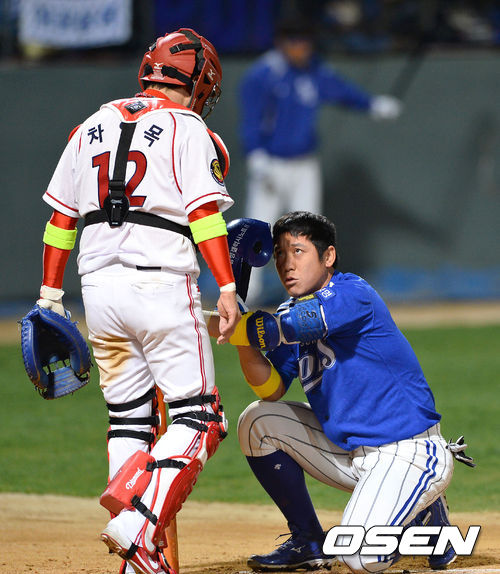 26일 오후 광주 무등구장에서 열린 '2013 한국야쿠르트 세븐 프로야구' KIA 타이거즈와 삼성 라이온즈의 경기, 7회초 삼성 선두타자 조동찬이 KIA 김진우의 몸쪽 가까운 공에 놀라고 있다