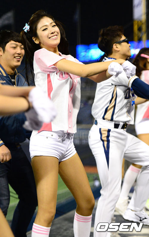 26일 오후 창원 마산야구장에서 열린 2013 한국야쿠르트 세븐프로야구 NC 다이노스와 두산 베어스의 경기, NC 치어리더 김연정이 화려한 공연을 펼치고 있다.