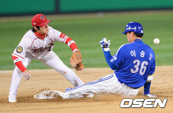26일 오후 광주 무등구장에서 열린 '2013 한국야쿠르트 세븐 프로야구' KIA 타이거즈와 삼성 라이온즈의 경기, 8회초 무사 2루 삼성 이승엽이 1타점 적시타를 날린 후 2루에 세이프 되고 있다