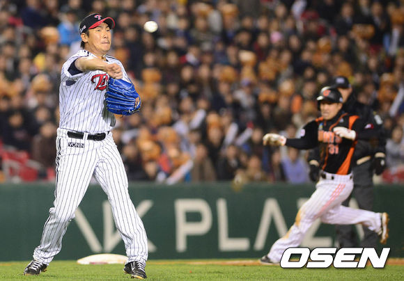26일 오후 서울 잠실구장에서 열린 '2013 한국야쿠르트 세븐 프로야구' LG 트윈스와 롯데 자이언츠의 경기 7회초 2사 2루 전준우의 내야땅볼을 이동현이 1루로 송구하고 있다. 송구는 실책으로 이어져 2루주자 손아섭은 득점, 전준우는 2루까지 진루.