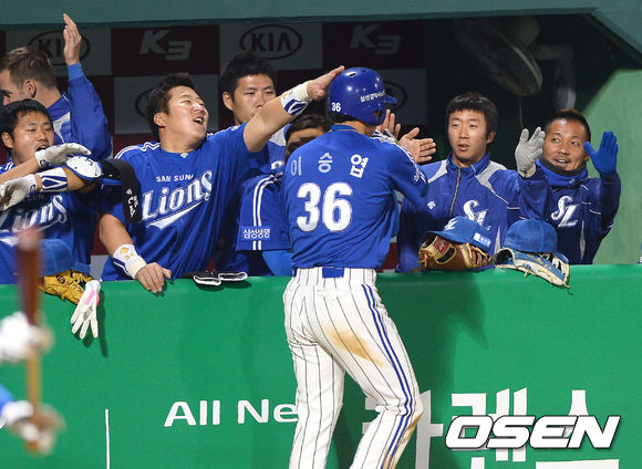 26일 오후 광주 무등구장에서 열린 '2013 한국야쿠르트 세븐 프로야구' KIA 타이거즈와 삼성 라이온즈의 경기, 8회초 무사 1,3루 삼성 채태인의 안타때 3루 주자 이승엽이 홈을 밟은 후 동료들의 축하를 받고 있다