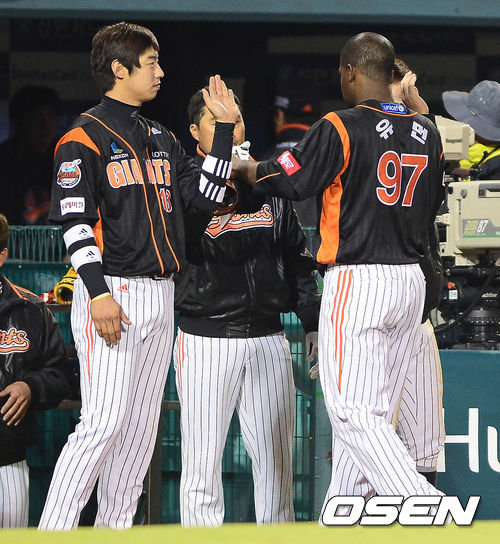 26일 오후 서울 잠실구장에서 열린 '2013 한국야쿠르트 세븐 프로야구' LG 트윈스와 롯데 자이언츠의 경기 7회말을 마친 유먼이 덕아웃으로 향하며 동료들과 하이파이브를 하고 있다.