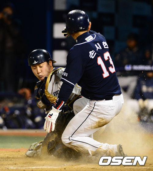 26일 오후 창원 마산야구장에서 열린 2013 한국야쿠르트 세븐프로야구 NC 다이노스와 두산 베어스의 경기, 8회초 1사 2루에서 두산 이종욱의 중전 적시타 때 2루주자 손시헌이 홈으로 쇄도해 세이프 되고 있다.
