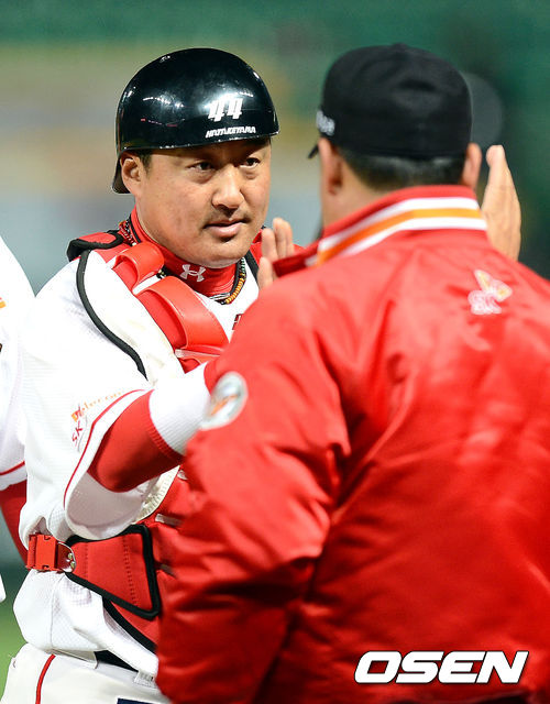 경기 종료 후 승리를 거둔 SK 조인성이 이만수감독과 하이파이브를 하고 있다. / youngrae@osen.co.kr