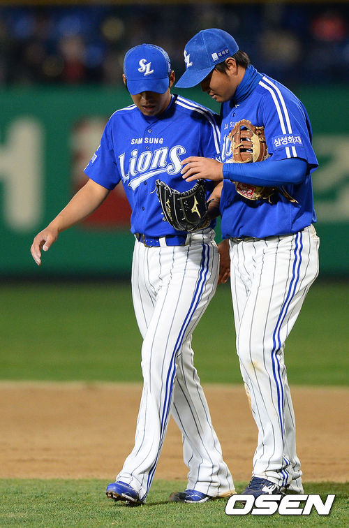 경기종료 후 생애 첫 완봉승을 거둔 삼성 윤성환이 채태인에게 기념구를 받고 있다./ soul1014@osen.co.kr