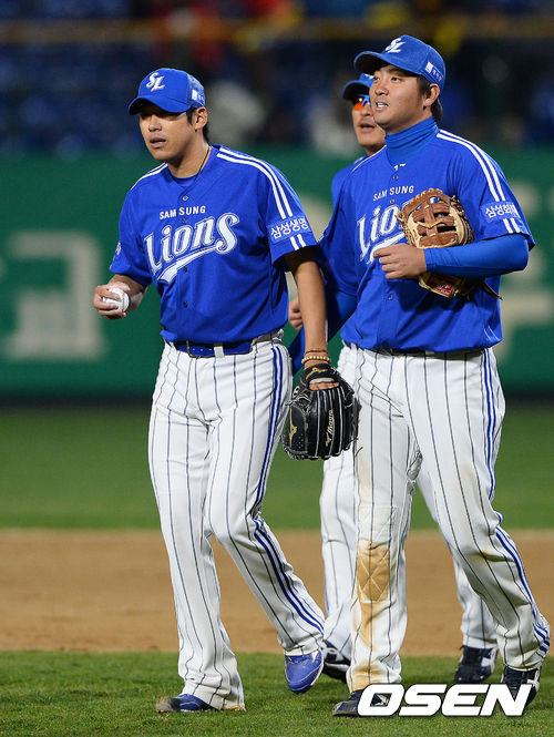 경기종료 후 생애 첫 완봉승을 거둔 삼성 윤성환이 채태인에게 기념구를 받고 있다./ soul1014@osen.co.kr