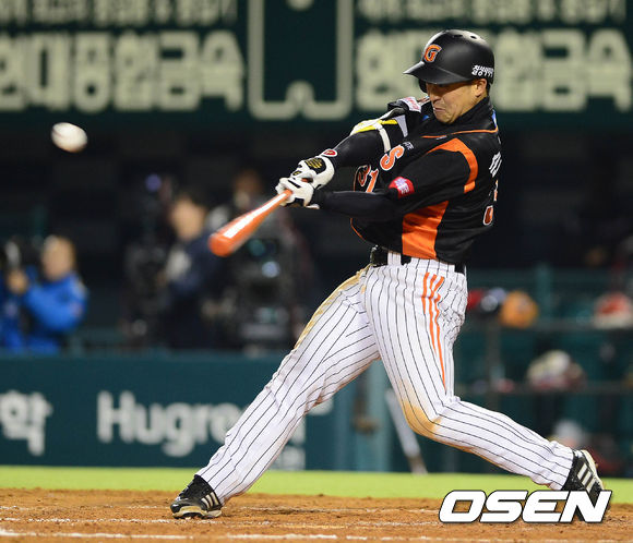 26일 오후 서울 잠실구장에서 열린 '2013 한국야쿠르트 세븐 프로야구' LG 트윈스와 롯데 자이언츠의 경기 9회초 선두타자 손아섭이 좌전안타를 치고 있다.