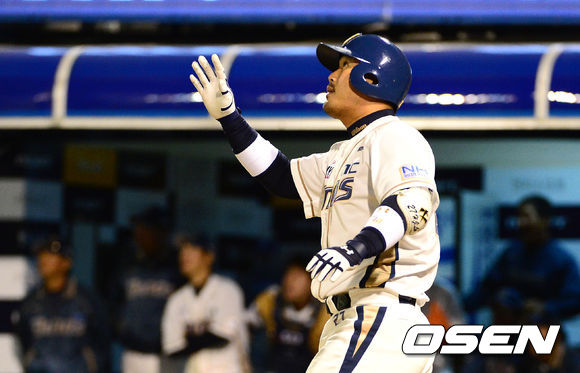 26일 오후 창원 마산야구장에서 열린 2013 한국야쿠르트 세븐프로야구 NC 다이노스와 두산 베어스의 경기, 8회말 2사 3루에서 NC 이호준이 좌월 투런 홈런을 타구를 바라보고 있다.
