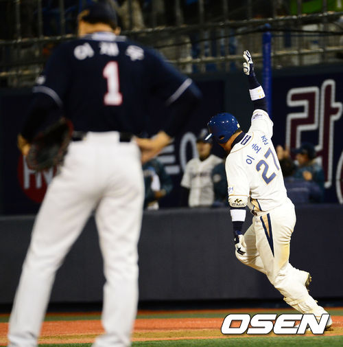 26일 오후 창원 마산야구장에서 열린 2013 한국야쿠르트 세븐프로야구 NC 다이노스와 두산 베어스의 경기, 8회말 2사 3루에서 NC 이호준이 좌월 투런 홈런을 치고 그라운드를 돌고 있다.