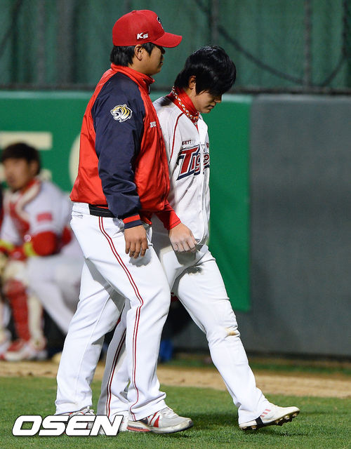 9회초 2사 1루서 삼성 이승엽의 외야플라이 때 좌익수 신종길과 충돌한 KIA 김선빈이 부축받으며 교체되고 있다./ soul1014@osen.co.kr