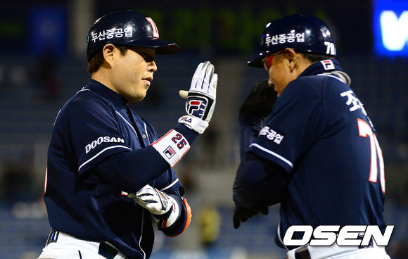 26일 오후 창원 마산야구장에서 열린 2013 한국야쿠르트 세븐프로야구 NC 다이노스와 두산 베어스의 경기,9회초 1사 만루에서 두산 양의지가 우월 만루 홈런을 치고 조원우 코치와 하이파이브를 하고 있다.