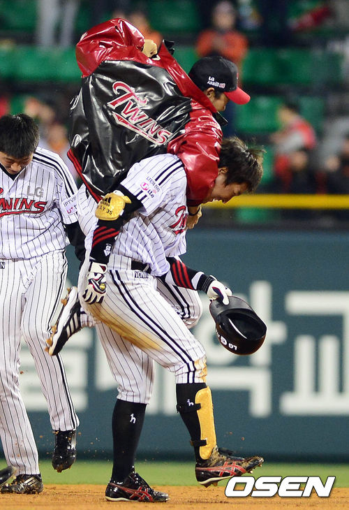 26일 오후 서울 잠실구장에서 열린 '2013 한국야쿠르트 세븐 프로야구' LG 트윈스와 롯데 자이언츠의 경기 종료 후 이진영이 동료들에게 격한 축하를 받고 있다.