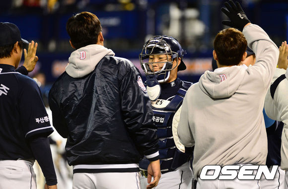 경기 종료 후 두산 양의지가 동료들과 승리의 기쁨을 나누고 있다. /sunday@osen.co.kr