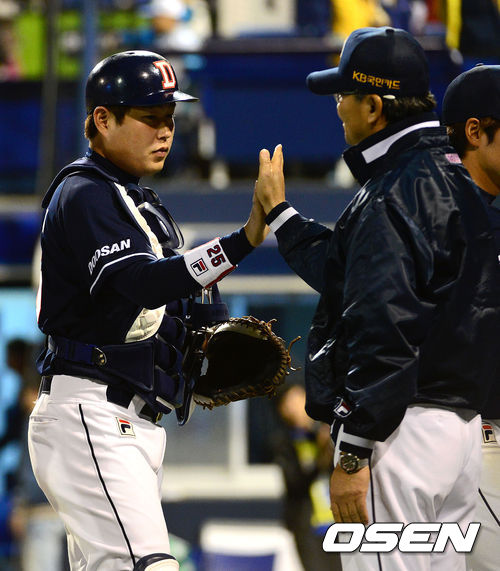 경기 종료 후 두산 양의지가 김진욱 감독과 하이파이브를 하고 있다. /sunday@osen.co.kr