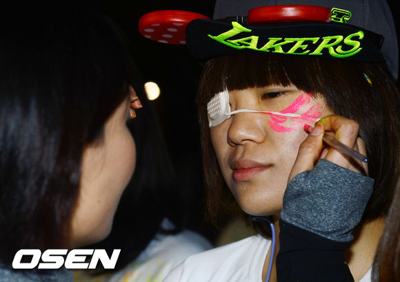 참가자가 얼굴에 형광 페이팅을 하고 있다.