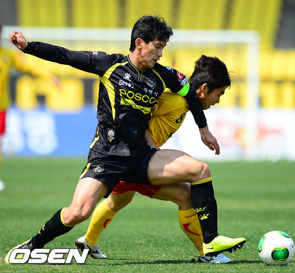 27일 오후 현대오일뱅크 K리그 클래식 2013 9라운드 성남 일화와 전남 드래곤즈의 경기가 경기도 성남시 탄천종합운동장에서 열렸다. 전반 전남 이승희와 성남 김성준이 치열한 볼다툼을 하고 있다.