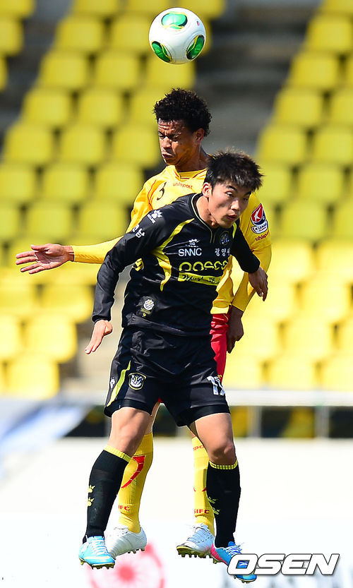 27일 오후 현대오일뱅크 K리그 클래식 2013 9라운드 성남 일화와 전남 드래곤즈의 경기가 경기도 성남시 탄천종합운동장에서 열렸다. 전반 전남 이종호와 성남 애드깔로스가 공중볼 다툼을 하고 있다.