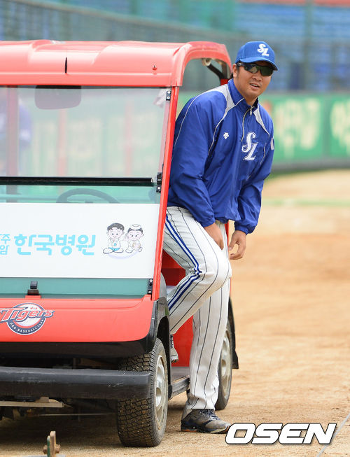 27일 오후 광주 무등구장에서 열리는 '2013 한국야쿠르트 세븐 프로야구' KIA 타이거즈와 삼성 라이온즈의 경기, 경기에 앞서 삼성 채태인이 카트를 운전한 후 하차하고 있다