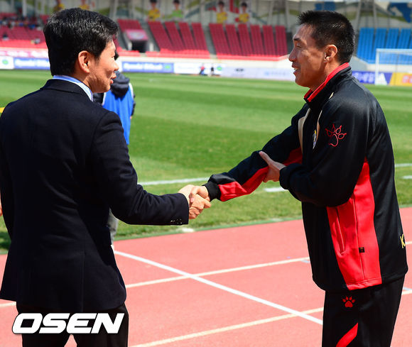 27일 오후 현대오일뱅크 K리그 클래식 2013 9라운드 성남 일화와 전남 드래곤즈의 경기가 경기도 성남시 탄천종합운동장에서 열렸다. 정몽규 대한축구협회 회장이 전남 하석주 감독과 악수를 나누고 있다.