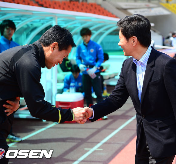 27일 오후 현대오일뱅크 K리그 클래식 2013 9라운드 성남 일화와 전남 드래곤즈의 경기가 경기도 성남시 탄천종합운동장에서 열렸다. 정몽규 대한축구협회 회장이 성남 안익수 감독과 악수를 나누고 있다.