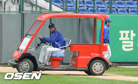 27일 오후 광주 무등구장에서 열리는 '2013 한국야쿠르트 세븐 프로야구' KIA 타이거즈와 삼성 라이온즈의 경기, 경기에 앞서 삼성 채태인이 카트를 운전하고 있다
