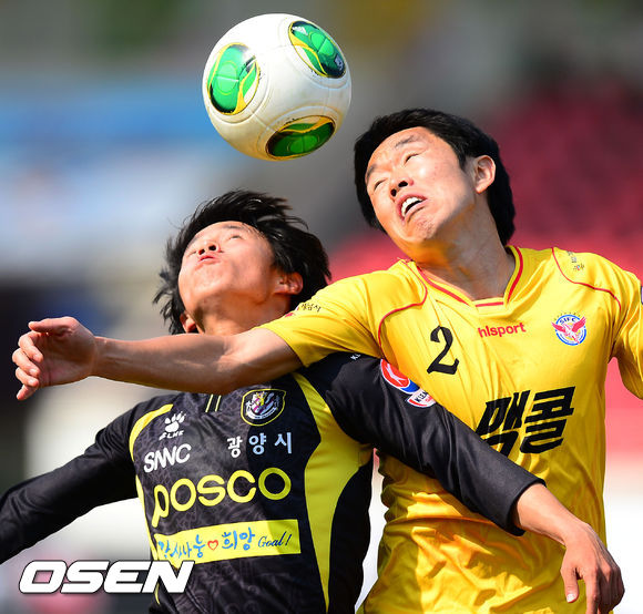 27일 오후 현대오일뱅크 K리그 클래식 2013 9라운드 성남 일화와 전남 드래곤즈의 경기가 경기도 성남시 탄천종합운동장에서 열렸다. 후반 전남 심동운과 성남 현영민이 볼 다툼을 하고 있다.