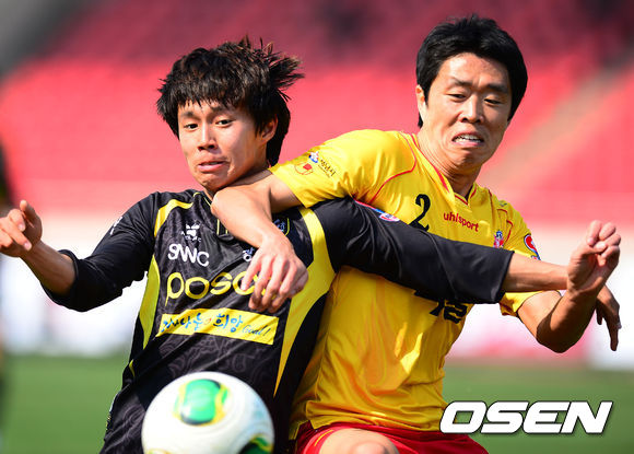 27일 오후 현대오일뱅크 K리그 클래식 2013 9라운드 성남 일화와 전남 드래곤즈의 경기가 경기도 성남시 탄천종합운동장에서 열렸다. 후반 전남 심동운과 성남 현영민이 볼 다툼을 하고 있다.