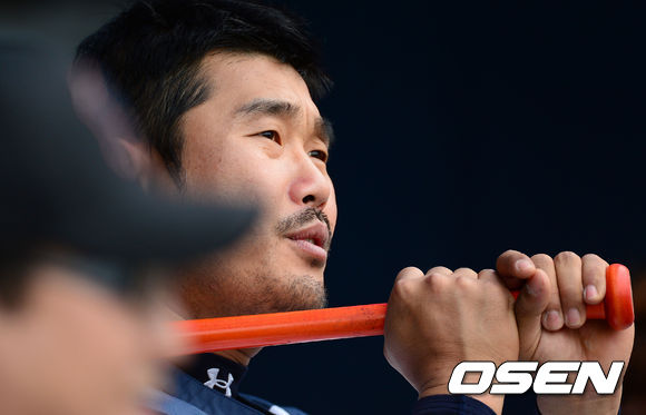 27일 오후 창원 마산야구장에서 열린 2013 한국야쿠르트 세븐프로야구 NC 다이노스와 두산 베어스의 경기, 경기에 앞서 NC 이호준이 취재진과 이야기를 나누고 있다.