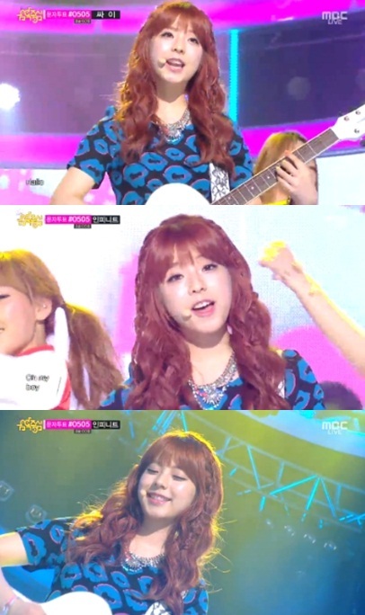 주니엘은 27일 오후 방송된 MBC '쇼! 음악중심'에서 신곡 '귀여운 남자'의 컴백 무대를 펼쳤다. 이날 주니엘은 상큼한 미소와 인형 같은 외모로 시선을 사로잡았다. 입술 모양이 프린트 된 파란색 미니드레스로 발랄한 느낌을 내기도 했다.
