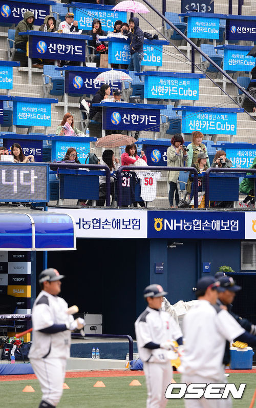 27일 오후 창원 마산야구장에서 열린 2013 한국야쿠르트 세븐프로야구 NC 다이노스와 두산 베어스의 경기, 경기에 앞서 관중이 우산을 펼치고 훈련 중인 두산 선수들을 바라보고 있다.