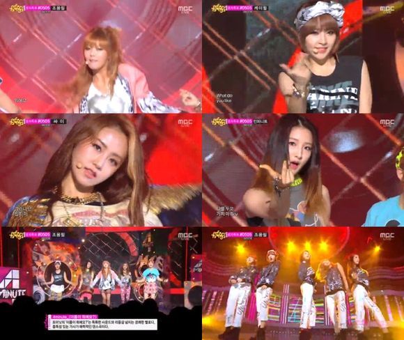 포미닛은 27일 오후 방송된 MBC '쇼! 음악중심'에서 컴백 타이틀 곡 '이름이 뭐예요?'와 수록곡 '왓에버(Whatever)'를 열창했다.