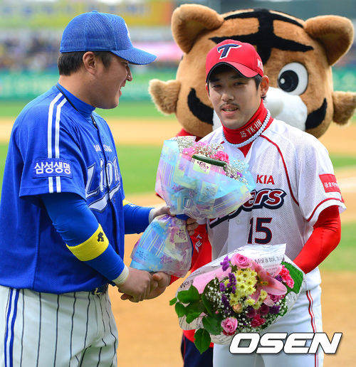 27일 오후 광주 무등구장에서 열리는 '2013 한국야쿠르트 세븐 프로야구' KIA 타이거즈와 삼성 라이온즈의 경기, 경기에 앞서 KIA 이용규가 KBO 64번째 통산 1000안타 달성 시상식을 가지고 있다. 이용규는 지난 4월 5일 롯데와의 경기에서 1000안타 기록을 세웠다.