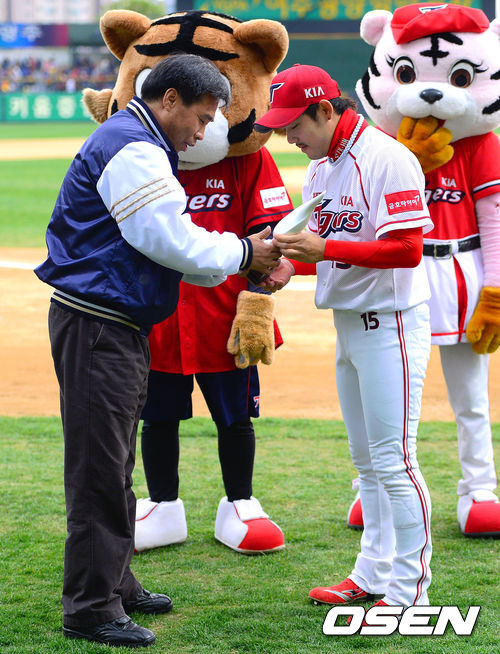 27일 오후 광주 무등구장에서 열리는 '2013 한국야쿠르트 세븐 프로야구' KIA 타이거즈와 삼성 라이온즈의 경기, 경기에 앞서 KIA 이용규가 KBO 64번째 통산 1000안타 달성 시상식을 가지고 있다. 이용규는 지난 4월 5일 롯데와의 경기에서 1000안타 기록을 세웠다.