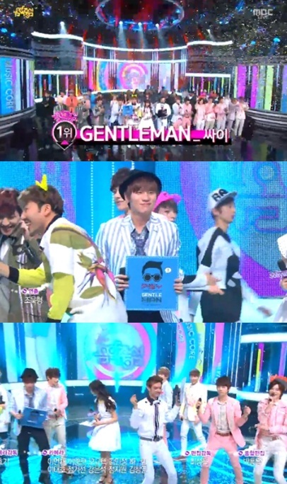 싸이 '젠틀맨'은 27일 오후 방송된 '음악중심'에서 인피니트 '남자가 사랑할 때'와 경쟁 끝에 1위에 올랐다. 하지만 싸이는 지난 25일 '젠틀맨'의 해외 프로모션 차 출국하면서 이날 '음악중심'에 자리하지 못했다.