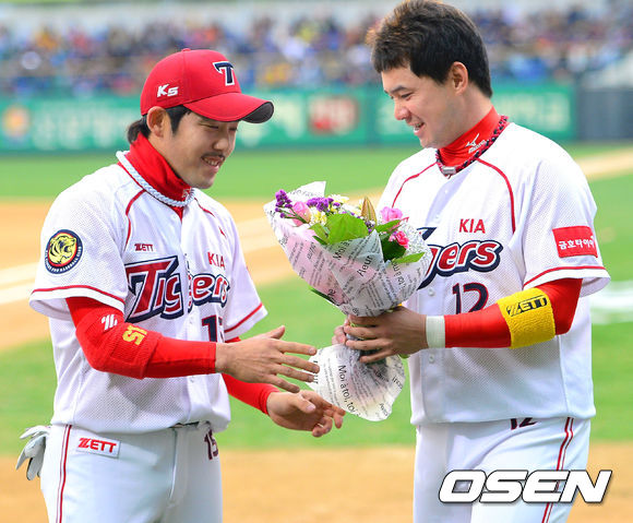 27일 오후 광주 무등구장에서 열리는 '2013 한국야쿠르트 세븐 프로야구' KIA 타이거즈와 삼성 라이온즈의 경기, 경기에 앞서 KIA 이용규가 KBO 64번째 통산 1000안타 달성 시상식을 가지고 있다. 이용규는 지난 4월 5일 롯데와의 경기에서 1000안타 기록을 세웠다.