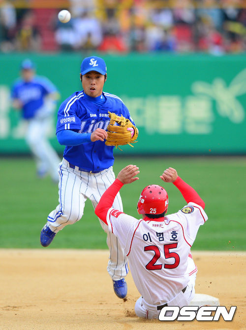 27일 오후 광주 무등구장에서 열린 '2013 한국야쿠르트 세븐 프로야구' KIA 타이거즈와 삼성 라이온즈의 경기, 1회말 1사 1,3루 KIA 나지완의 내야땅볼때 삼성 김태완 2루수가 1루 주자 이범호를 포스아웃시킨 후 병살시도하고 있다.