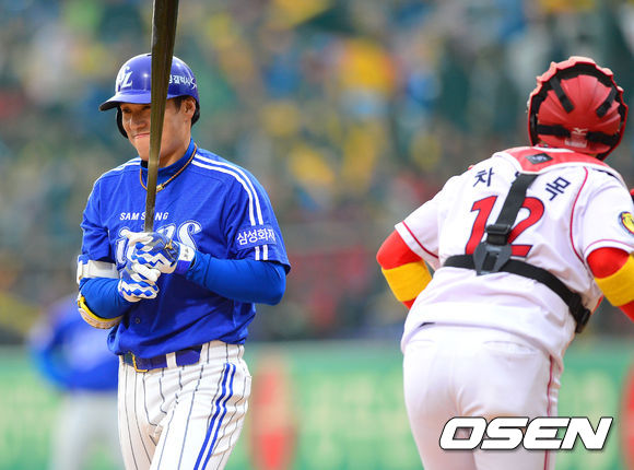 27일 오후 광주 무등구장에서 열린 '2013 한국야쿠르트 세븐 프로야구' KIA 타이거즈와 삼성 라이온즈의 경기, 1회초 삼성 이승엽이 삼진 아웃 당한뒤 아쉬워하고 있다
