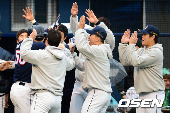 27일 오후 창원 마산야구장에서 열린 2013 한국야쿠르트 세븐프로야구 NC 다이노스와 두산 베어스의 경기, 1회초 무사 1,2루에서 두산 김현수가 우월 스리런 홈런을 치고 덕아웃에서 동료들의 축하를 받고 있다.