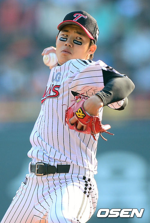 27일 오후 서울 잠실구장에서 열린 '2013 한국야쿠르트 세븐 프로야구' LG 트윈스와 롯데 자이언츠의 경기 LG 선발 임찬규가 힘차게 공을 뿌리고 있다.