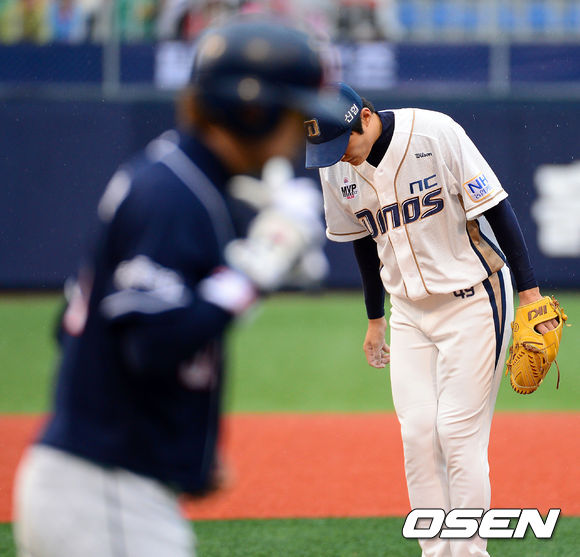 27일 오후 창원 마산야구장에서 열린 2013 한국야쿠르트 세븐프로야구 NC 다이노스와 두산 베어스의 경기, 1회초 무사 1루에서 NC 이태양이 두산 정수빈에 몸에 맞는 볼로 출루를 허용하고 있다.