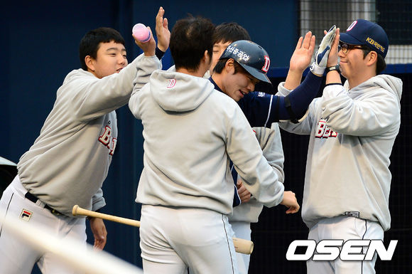 27일 오후 창원 마산야구장에서 열린 2013 한국야쿠르트 세븐프로야구 NC 다이노스와 두산 베어스의 경기, 2회초 1사에서 두산 민병헌이 중월 솔로 홈런을 치고 덕아웃에서 동료들의 축하를 바독 있다.