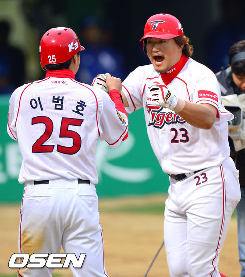 27일 오후 광주 무등구장에서 열린 '2013 한국야쿠르트 세븐 프로야구' KIA 타이거즈와 삼성 라이온즈의 경기, 4회말 1사 1,2루 KIA 최희섭이 선취 3점 홈런을 날리고 이범호와 하이파이브를 하고 있다