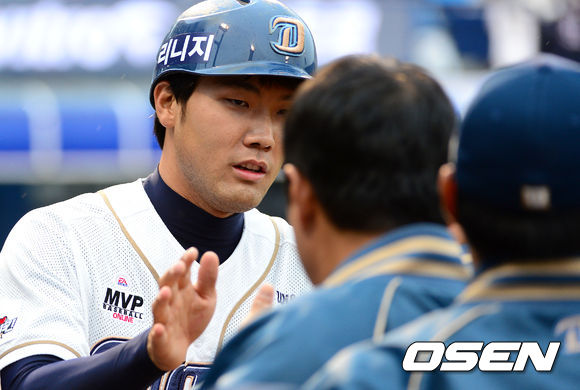 27일 오후 창원 마산야구장에서 열린 2013 한국야쿠르트 세븐프로야구 NC 다이노스와 두산 베어스의 경기, 2회말 무사 1루에서 NC 지석훈의 좌전 적시 2루타 때 홈을 밟은 1루주자 조평호가 덕아웃에서 동료들의 축하를 받고 있다.