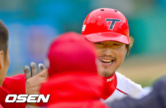 27일 오후 광주 무등구장에서 열린 '2013 한국야쿠르트 세븐 프로야구' KIA 타이거즈와 삼성 라이온즈의 경기, 4회말 1사 1,2루 KIA 최희섭이 선취 3점 홈런을 날리고 동료들의 축하를 받고 있다