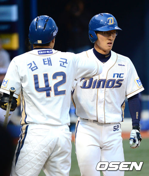 27일 오후 창원 마산야구장에서 열린 2013 한국야쿠르트 세븐프로야구 NC 다이노스와 두산 베어스의 경기, 4회말 1사에서 NC 노진혁이 중전 안타 뒤 그라운드 홈런을 기록하고 홈에서 김태군의 축하를 받고 있다.