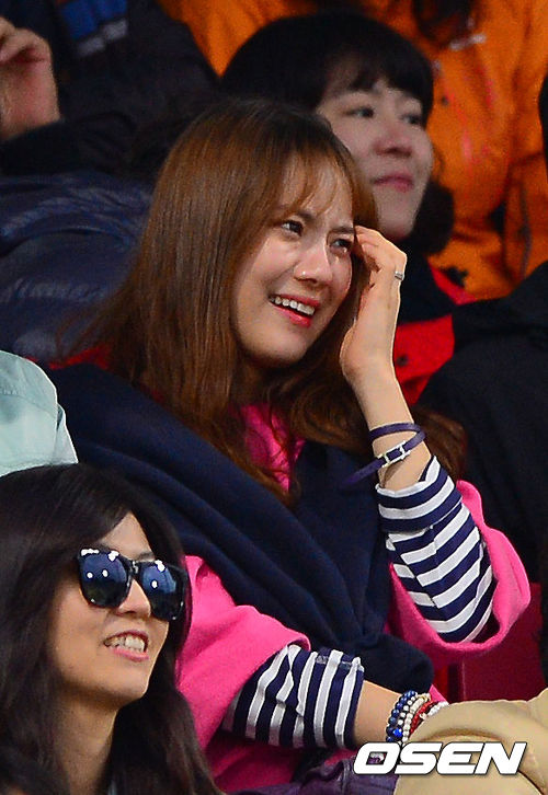 27일 오후 광주 무등구장에서 열린 '2013 한국야쿠르트 세븐 프로야구' KIA 타이거즈와 삼성 라이온즈의 경기, 5회말 1사 3루 KIA 이범호의 내야땅볼때 3루 주자 이용규가 협살에 걸려 아웃됐다. 이용규 아내 유하나가 안타까워하고 있다