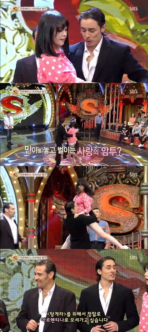 민아는 27일 오후 방송된 SBS 예능 프로그램 '놀라운 대회 스타깅'(이하 '스타킹')에서 아르헨티나 최고의 탱고 뮤지컬팀 탕게라팀의 남자 무용수들과 탱고를 췄다.